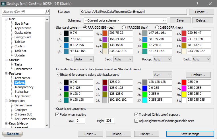 For the quake-style terminal, I exported my ConEmu config-file and then edited that one: