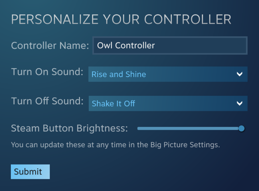 Steam beta users can as of right now (16. December 2015) also change the backlight LED of the Steam button, and change the controllers on / off sounds.