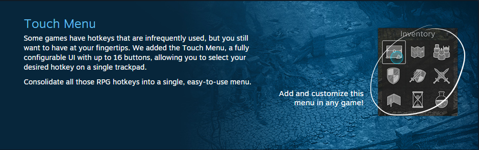 While being configurable, there is no way to currently access them. Touch menus would be incredibly useful when browsing the Web on your couch, or making the steam controller a hot-key device.