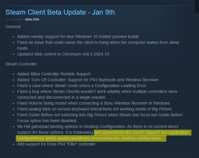GloSC got mentioned from Valve in the Steam client beta changelog from the 9. of January and has been, for better or for worse, may or may not involved in the second removal from XInput bindings in desktop configurations… (Sorry… ?)